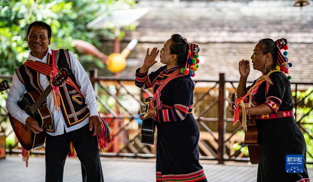 在云南省普洱市澜沧拉祜族自治县老达保村,致富带头人、拉祜族村民李娜倮(中)带领村民演出(2022年7月5日摄)。新华社记者 江文耀 摄