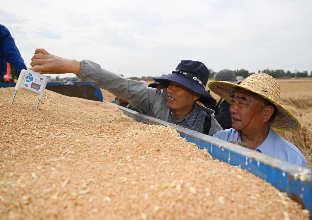 5月29日,在太和县淙祥现代农业种植专业合作社,徐淙祥(右)和农技专家一起测量小麦中的含水量。新华社记者周牧 摄