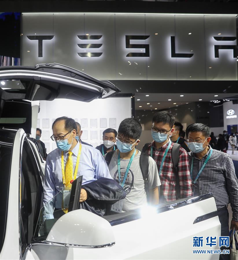 11月6日,人们在进博会汽车展区参观特斯拉Model X电动汽车。 在第三届中国国际进口博览会上,多个品牌展示的新能源汽车成为参观者关注的焦点。 新华社记者 丁汀 摄