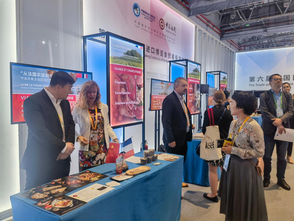 “从法国农场到中国餐桌”——第六届进博会开幕第二天,食品及农产品展区的一个角落,40多家法国农食企业集体亮相,与国内采购商面对面交流对接。