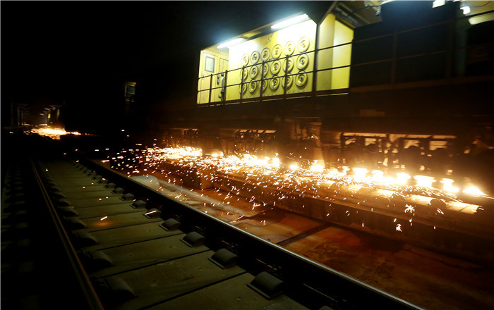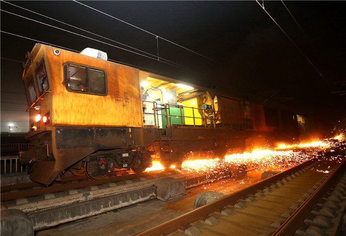 ↑1月9日,正在进行钢轨打磨作业的打磨车下火花四溅。 新华社记者 方喆 摄