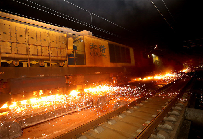 在午夜至黎明的高速列车停运时间,中国铁路上海局集团有限公司上海大型养路机械运用检修段的职工驾驶钢轨打磨车,争分夺秒对规定线路的钢轨进行“整形打磨”。由5节作业车组成的钢轨打磨车全长114米,装备96个打磨电机,可将钢轨纵向1000毫米范围内的高度差控制在0.2毫米以内,使钢轨更加平顺。这些被称为“火花侠”的钢轨打磨员工,通过每日“黑白颠倒”的辛勤劳作,保障乘客旅途安全、平稳。