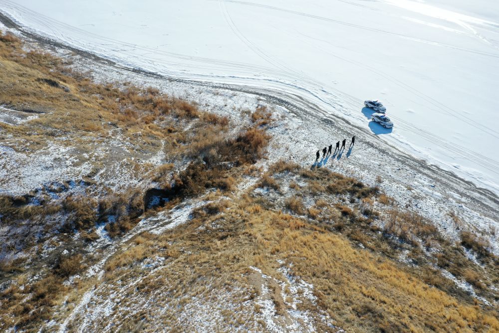 ↑1月23日,呼伦贝尔市公安局呼伦湖国家级自然保护区分局小河口派出所民警在呼伦湖岸上的高处巡逻(无人机照片)。