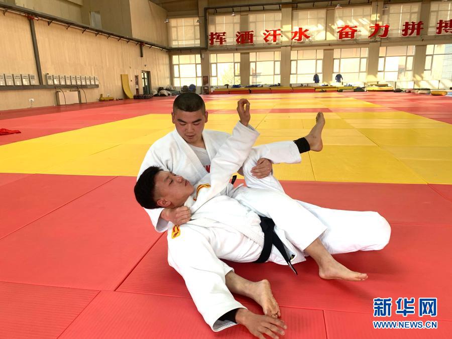 2月24日,在多巴基地,青海体工一大队柔道队队员冶承毓(前)和队友吕寻才在训练中。新华社记者 李琳海 摄