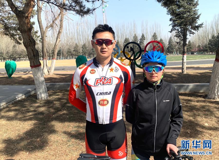 2月24日,在多巴基地,青海省体育运动学校自行车队教练吴佩伦(左)和队员李莹在训练后合影。新华社记者 李琳海 摄