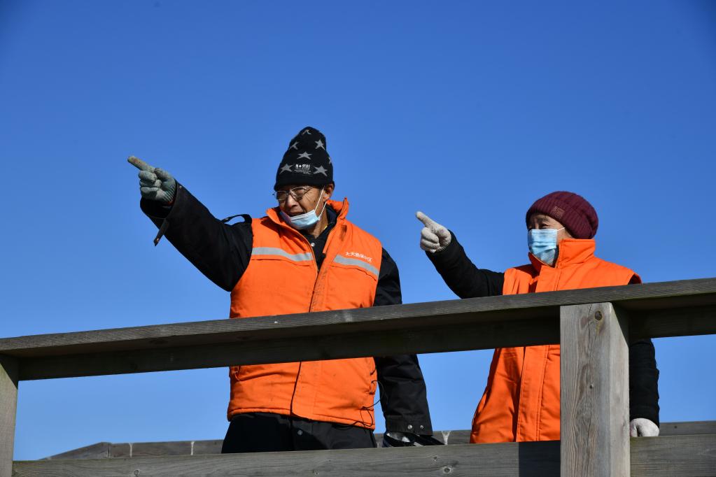山东荣成,中国大天鹅之乡,是鸟类南迁北移的重要中转站和越冬栖息地。每年10月至次年3月,近万只大天鹅从遥远的西伯利亚飞到这里越冬。十几年前,刘志斌、赵淑珍夫妇从黑龙江齐齐哈尔退休来荣成养老。2017年5月,一个偶然的机会,他们来到天鹅湖,立刻被这群美丽的白色精灵深深吸引。“齐齐哈尔是‘丹顶鹤之乡’,我俩一直都喜欢鸟,对鸟有感情。”赵淑珍说,当时正逢保护区招聘巡护员,两人当即报了名。