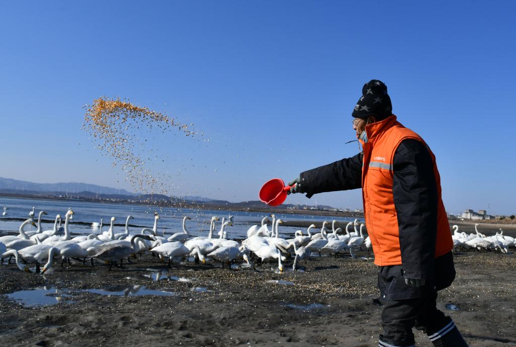 1月18日,刘志斌在为过冬的大天鹅补充食物。(新华社记者徐速绘摄)